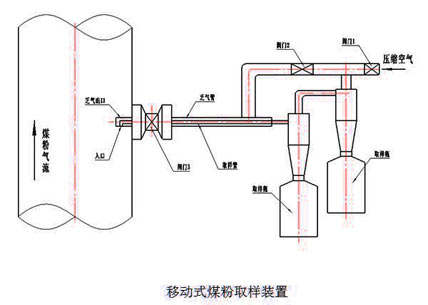 新型煤粉取樣器的工作原理如下:首先將安裝在固定座上并緊靠一次風(fēng)管的隔離閥門打開(kāi),固定式新型煤粉取樣裝置通過(guò)轉(zhuǎn)動(dòng)進(jìn)退傳動(dòng)裝置的手柄(移動(dòng)式新型煤粉取樣裝置則通過(guò)人工),將連為一體的取樣管和乏氣排放管伸入一次管內(nèi)的取樣位置,打開(kāi)壓縮空氣閥門,壓縮空氣流經(jīng)文丘里抽氣器時(shí)產(chǎn)生負(fù)壓,將一次風(fēng)管中的空氣和煤粉混合物,通過(guò)取樣管被吸入旋風(fēng)式的煤粉分離器,進(jìn)行氣、粉分離,分離下來(lái)的煤粉顆粒落入取樣罐中,乏氣經(jīng)抽氣器引射管和乏氣排放管返回一次風(fēng)管。每次取樣時(shí)間大約3-5分鐘。最后在實(shí)驗(yàn)室中對(duì)所取得樣本稱重篩選,以確定煤粉顆粒細(xì)度。