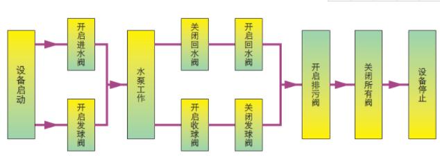 ⑷按綠色手動啟動按鈕,這時發(fā)球閥工作指示和收球閥工作指示燈亮起,過15秒后膠球輸送泵啟動,膠球泵工作指示燈亮起,清洗開始。清洗過程持續(xù)60秒,清洗完后,會關閉發(fā)球閥,打開補水閥,進入收球過程,60秒后,收球完成,關閉收球閥,15秒后開始排污,排污時間約10秒,排污完后,自動關閉排污閥、補水閥,整個清洗流程完成,準備進入*二次循環(huán)清洗指示。